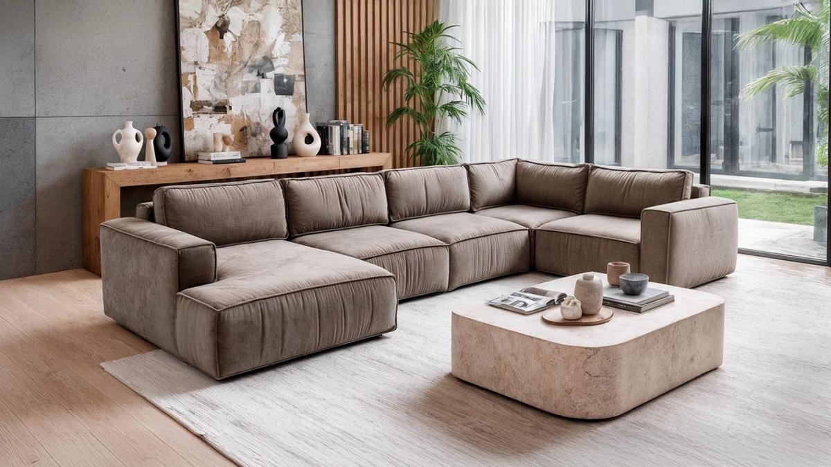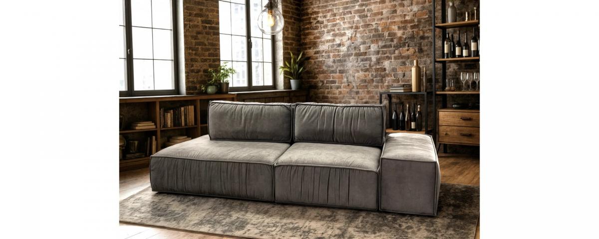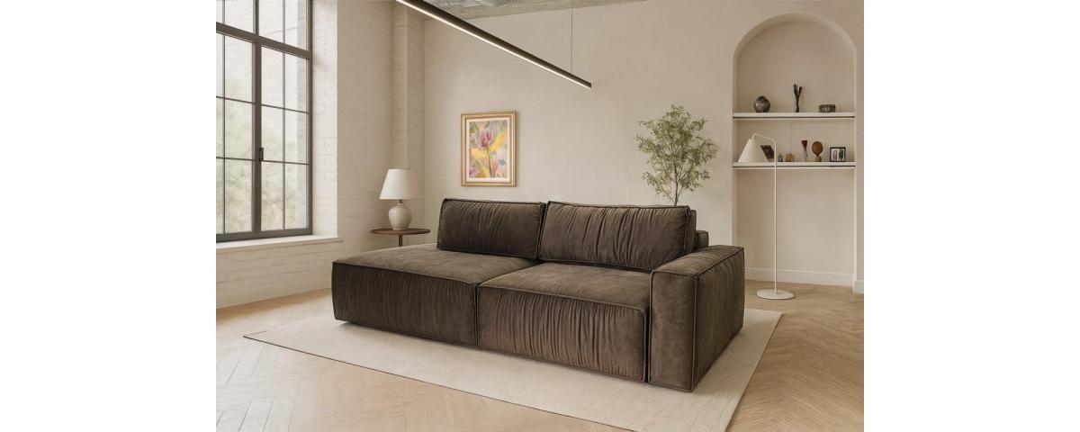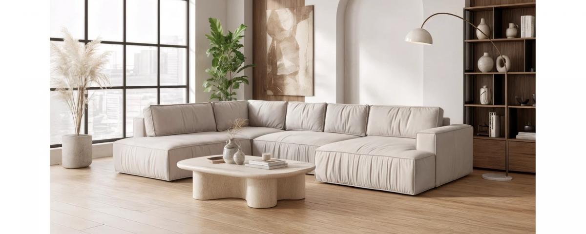 Всі елементи виконані у загальній стилістиці: об'ємні подушки, м'які лінії, сучасний дизайн із текстильними складками та глибокою посадкою.