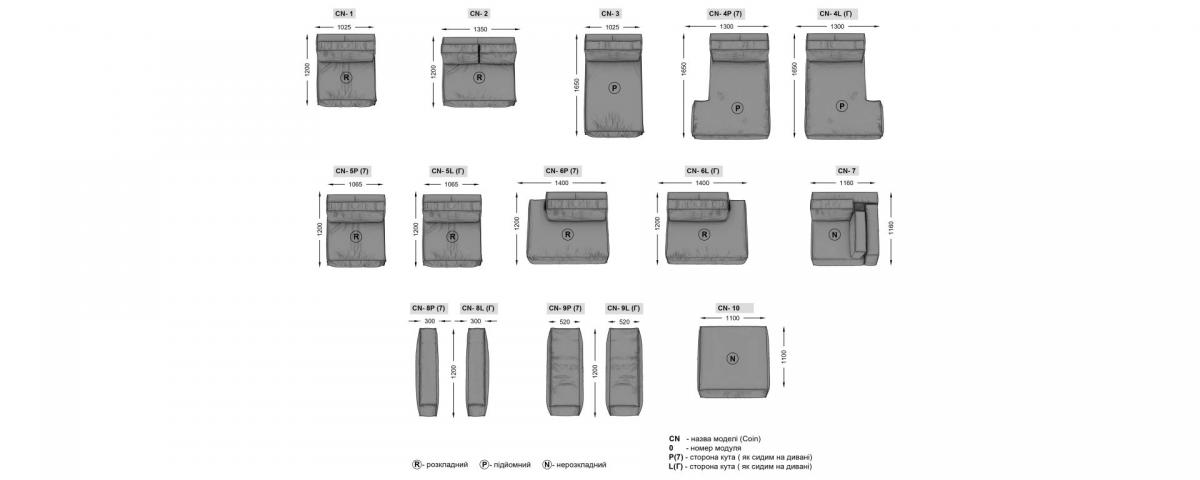 Мітки P(7) та L(Г) позначають бік кута, якщо сидіти на дивані (правий або лівий кут відповідно).